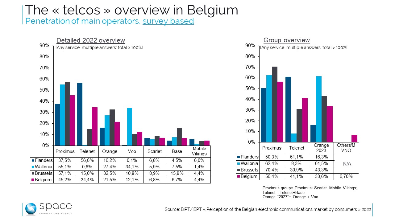 Op declaratieve basis maken zij het ook mogelijk de sterke punten van elk van de belangrijkste telco’s in het land per regio te evalueren. Dat levert geen revolutionaire conclusies op: met een penetratiegraad van 45% voor alle diensten samen blijft Proximus de belangrijkste operator van het land, met de pole position in Wallonië en het Brussels Hoofdstedelijk Gewest, maar de tweede plaats in Vlaanderen, vrij ver na de marktleider Telenet, die in het noorden van het land bijna 57% haalt. Afhankelijk van de regio is nummer 2 Orange (Brussel) of Voo (Wallonië).