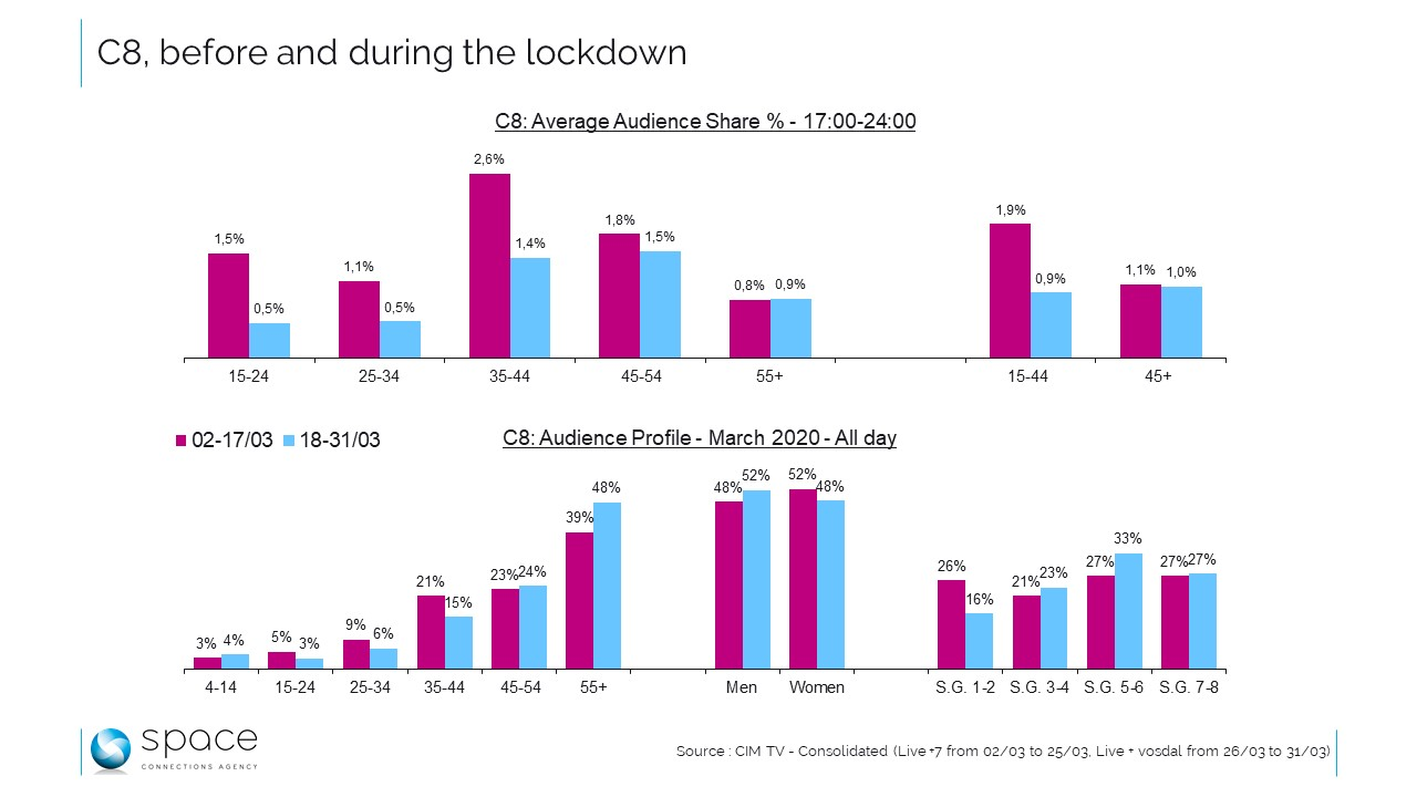 Natuurlijk is dit een tijdelijke situatie: de cijfers voor de lockdown zijn uiteraard de cijfers die als referentie dienen te worden genomen met het oog op de periode na de crisis. In deze periode is het profiel van C8 behoorlijk positief, met meer dan 60% van de jongeren onder de 55, een grote proportie afkomstig uit de hogere sociale klassen, veel VVA’s en bijna evenveel mannen als vrouwen. Momenteel is dit profiel (tijdelijk) ouder en minder gunstig. Voor de lockdown bezette C8 als kleine generalistische zender een eervolle plaats; vandaag presteert het onder zijn potentieel, maar dat zal ongetwijfeld weer veranderen als de crisis voorbij is.