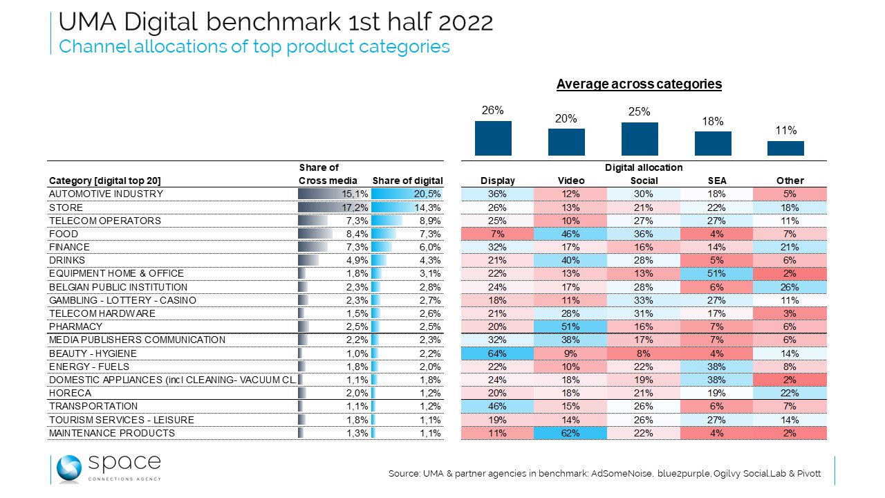 Maar terug naar het verslag voor het eerste semester van 2022: van de 44 door de UMA onderzochte productsectoren geeft de tabel van Space de top 20 van de investeerders in digitale reclame weer, samen met hun respectieve aandelen in de totale mediamarkt en de verdeling per digitaal kanaal voor elk van hen.