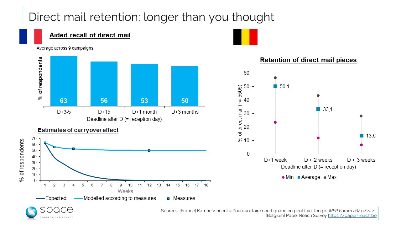 In ons land toonde de Paper Reach studie aan dat de levensduur van geadresseerde reclamepost zeker langer was dan het moment van ontvangst. Zo werd in alle sectoren samen 50% van de ontvangen direct mails na één week nog bewaard (en mogelijkerwijs geraadpleegd), 33% na 15 dagen en meer dan 13% 3 weken na ontvangst. Deze intersectorale gemiddelden kunnen variëren naargelang van de categorieën: het minimum na één week is bijvoorbeeld 23% en het maximum 56%. Hieruit blijkt dat er bij geadresseerde post sprake is van een “long tail”-effect, met een relatief groot effect in het begin (vgl. de vrij hoge memorisatiepercentages) en een persistentie die vrij lang kan zijn. Maar waarschijnlijk niet zo lang als in de Franse studie wordt gesuggereerd.