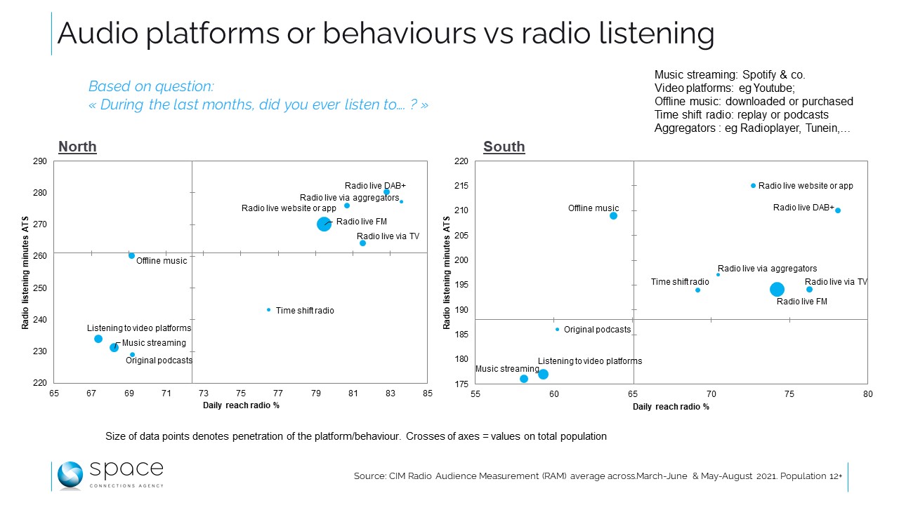 Conclusie? In het Noorden (vooral) en in het Zuiden consumeren de personen die vooral de vakjes “radio” aankruisen, of dat nu op DAB+, via internet of via TV is, meer radio dan het gemiddelde. Anderzijds zijn degenen die verklaren minder “mainstream” audio te consumeren, en dus meer originele podcasts, audiostreaming of videoplatforms, ook minder geneigd zijn naar de radio te luisteren. Maar – en dit is belangrijk – zij laten het medium niet volledig in de steek. Zij consumeren het relatief minder, dat is duidelijk, maar zij consumeren het toch nog in proporties die verre van verwaarloosbaar zijn, met penetraties van meer dan 55% per dag en een duur van ongeveer (ten minste) 3 uur per dag.