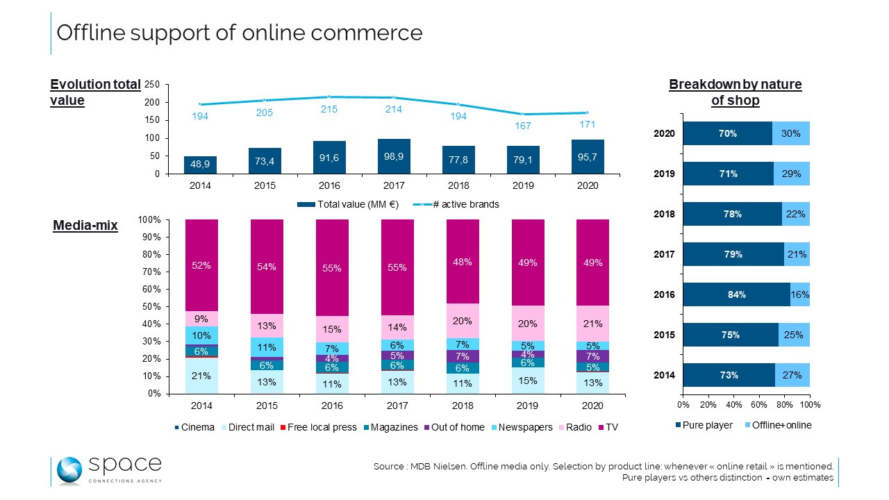 Dan blijkt dat de meest zichtbare merken hier de ‘pure players’ zijn, al naargelang het jaar goed voor 84 tot 70% van de waarde van het segment. Desalniettemin kunnen de andere ook communiceren op hun fysieke verkooppunten. Toch – en dit is een andere bijzonderheid van 2020 – was de communicatie van fysieke merken over hun online aanwezigheid nog nooit zo belangrijk. Het gaat om 30% van het totaal, een record, ook al is de stijging ten opzichte van 2019 (29%) verre van spectaculair. De mediamix binnen dit segment wordt heel duidelijk gedomineerd door audiovisuele media: 49% van het totaal in tv en 20% in radio over de afgelopen drie jaar. E-commerce blijft offline communiceren en doet dit op een redelijk consistente manier.Redactie: MM.