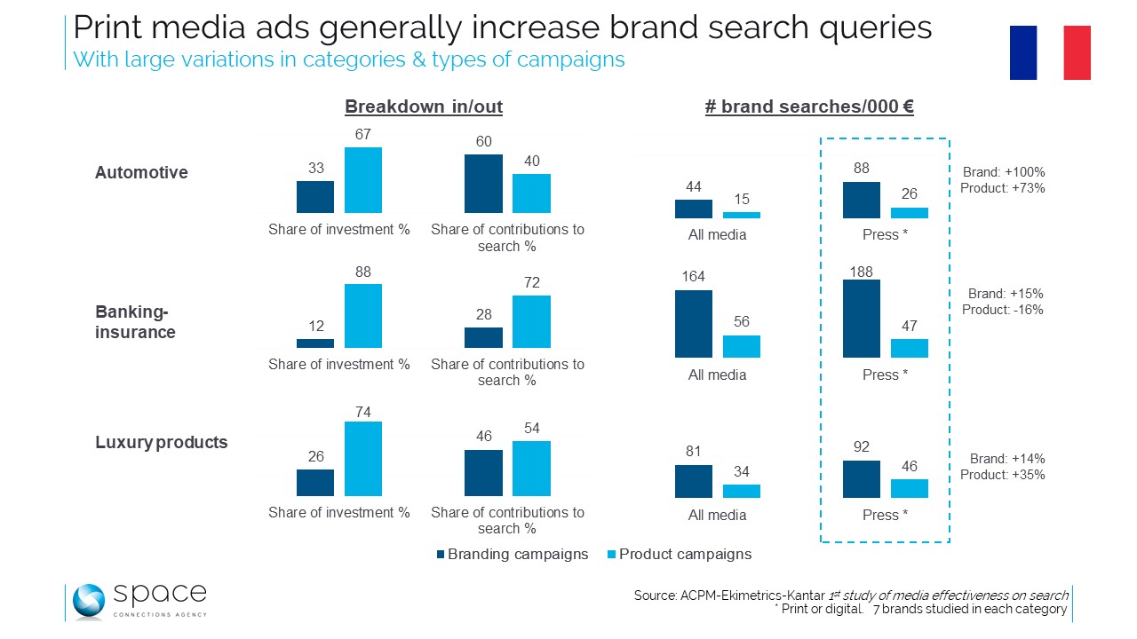 In het algemeen genereren media meer zoekopdrachten als ze brandingcampagnes uitdragen. Hun effect op productcampagnes is systematisch minder hoog. Jammer, want volgens de verantwoordelijken van de studie zijn er vaker productcampagnes in de drie bestudeerde sectoren. Ook al zijn alle media efficiënt voor brandingcampagnes, de pers is nog doeltreffender. In de categorie van de auto’s is het rendement inzake gegenereerde zoekopdrachten per investering van duizend euro twee keer groter dan dat van alle media. In de twee andere categorieën is de uplift van 15% in finance en van 14% in luxeproducten minder spectaculair, maar wel significant.