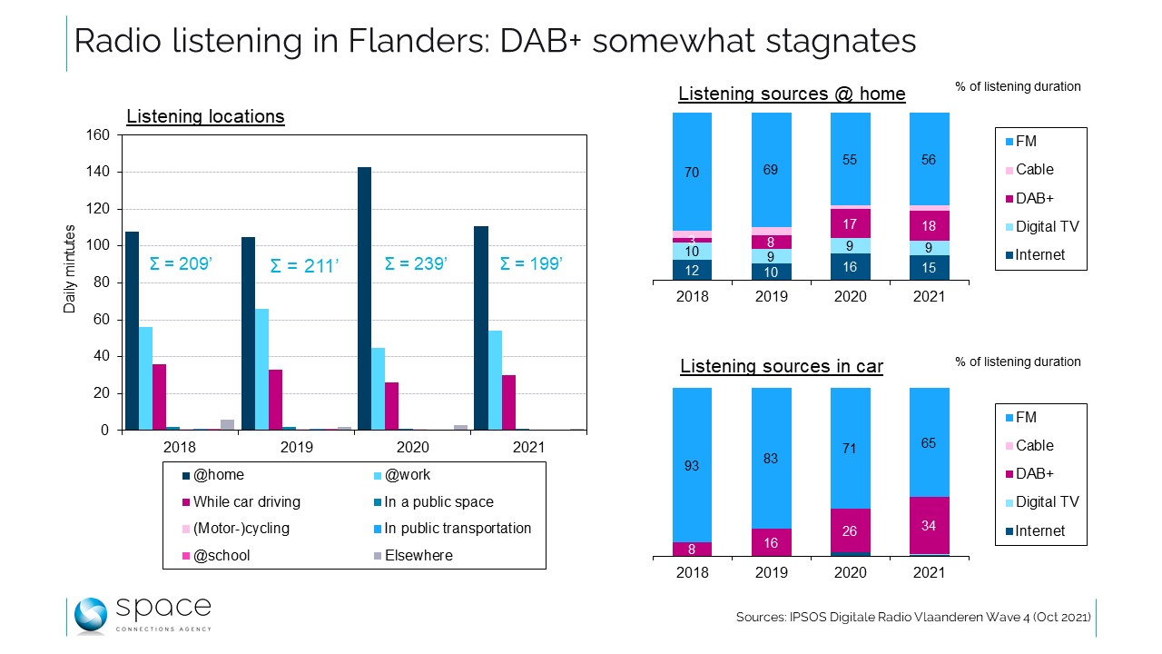 De editie van 2020 wierp een nuttig licht op het radiogedrag tijdens de lockdown, met meer luistersessies thuis en minder in de auto, doordat de auto zelf minder gebruikt werd. De editie van 2021 wijst op een terugkeer naar een vorm van nieuw normaal. Er wordt minder radio geluisterd gedurende langere perioden, in proporties die vergelijkbaar zijn met de periode voor corona.