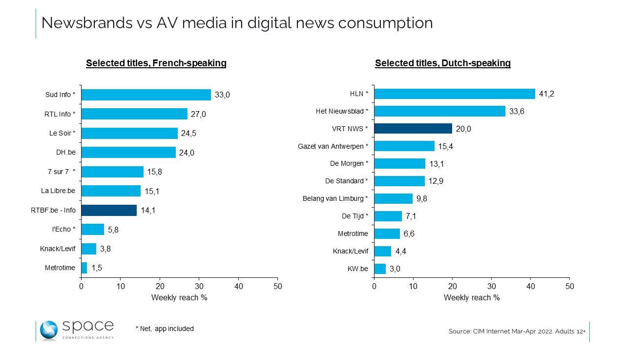 Om dit debat te kaderen kunnen we teruggrijpen naar de CIM Internet-studie om de nieuwskrachten in de twee regio’s te schatten. Dan blijkt dat RTBF info een relatief bescheiden aandeel vertegenwoordigt aan Franstalige zijde. Andere kanalen, waaronder volledig gratis media zoals 7 sur 7 en RTL Info, hebben een hogere reach. VRT NWS bevindt zich in een gevoeligere positie, omdat hij veel hoger scoort binnen zijn taaluniversum.