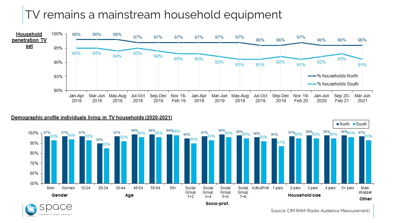In het Vlaamse deel van het land heeft 96% van de gezinnen er een (in 2018 was dat zelfs 98%). In het zuiden was er bij de laatste telling nog een televisietoestel in 91% van de huishoudens aanwezig. Er wordt weliswaar niet gevraagd naar het gebruik van het toestel. En volgens de Digimeter 2020 zegt 6% van de respondenten in Vlaanderen tevreden te zijn met streamingdiensten: ze hebben geen behoefte aan live tv-programma’s. Voor een aantal van deze personen betekent de aanwezigheid van een televisie in het huishouden niet dat zij lineaire televisie consumeren. De stabiliteit van de apparatuur in de huishoudens moet dan ook enigszins worden genuanceerd.