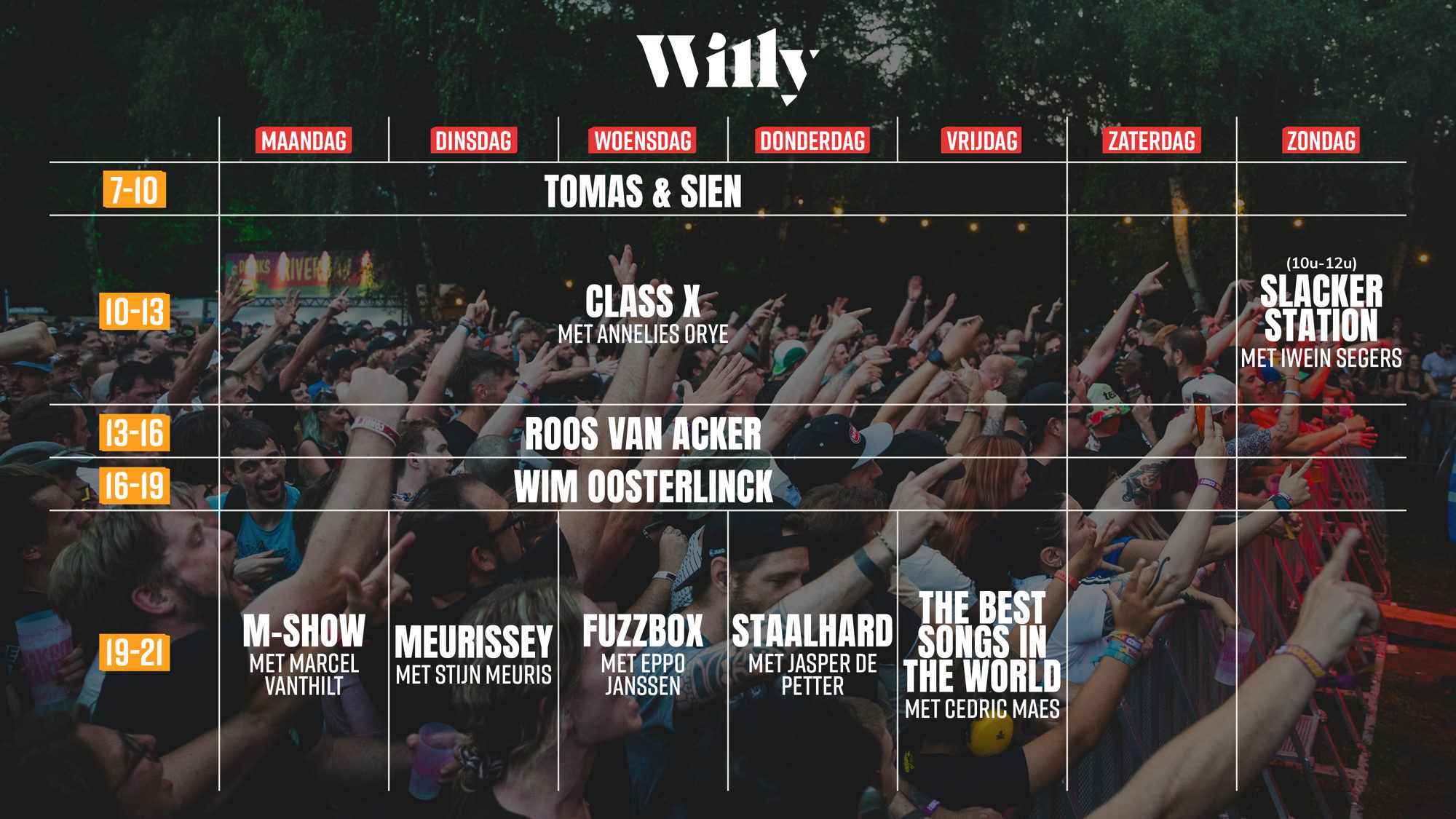 Vanaf maandag 1 september is het back to business in de studio in Vilvoorde. Dan schakelt Willy over op het vaste schema. Van Annelies Orye in de late ochtend (10u-13u) tot Roos Van Acker in de namiddag (13u-16u) en Wim Oosterlinck die het spitsuur voor z’n rekening neemt (16u-19u). ’s Avonds en in het weekend klinken de vertrouwde stemmen van Iwein Segers, Stijn Meuris, Marcel Vanthilt, Eppo Janssen en Cedric Maes en de nieuwe stem van Jasper De Petter.