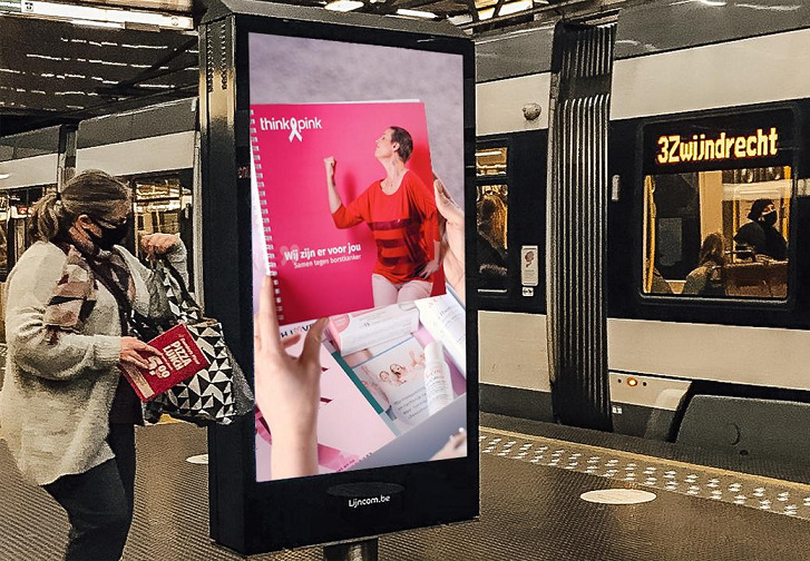 De out-of-home regie ondersteunt deze preventiecampagne door de digitale Think Pink-box campagne doorlopend uit te zenden op hun DOOH-netwerk in de Antwerpse premetro.