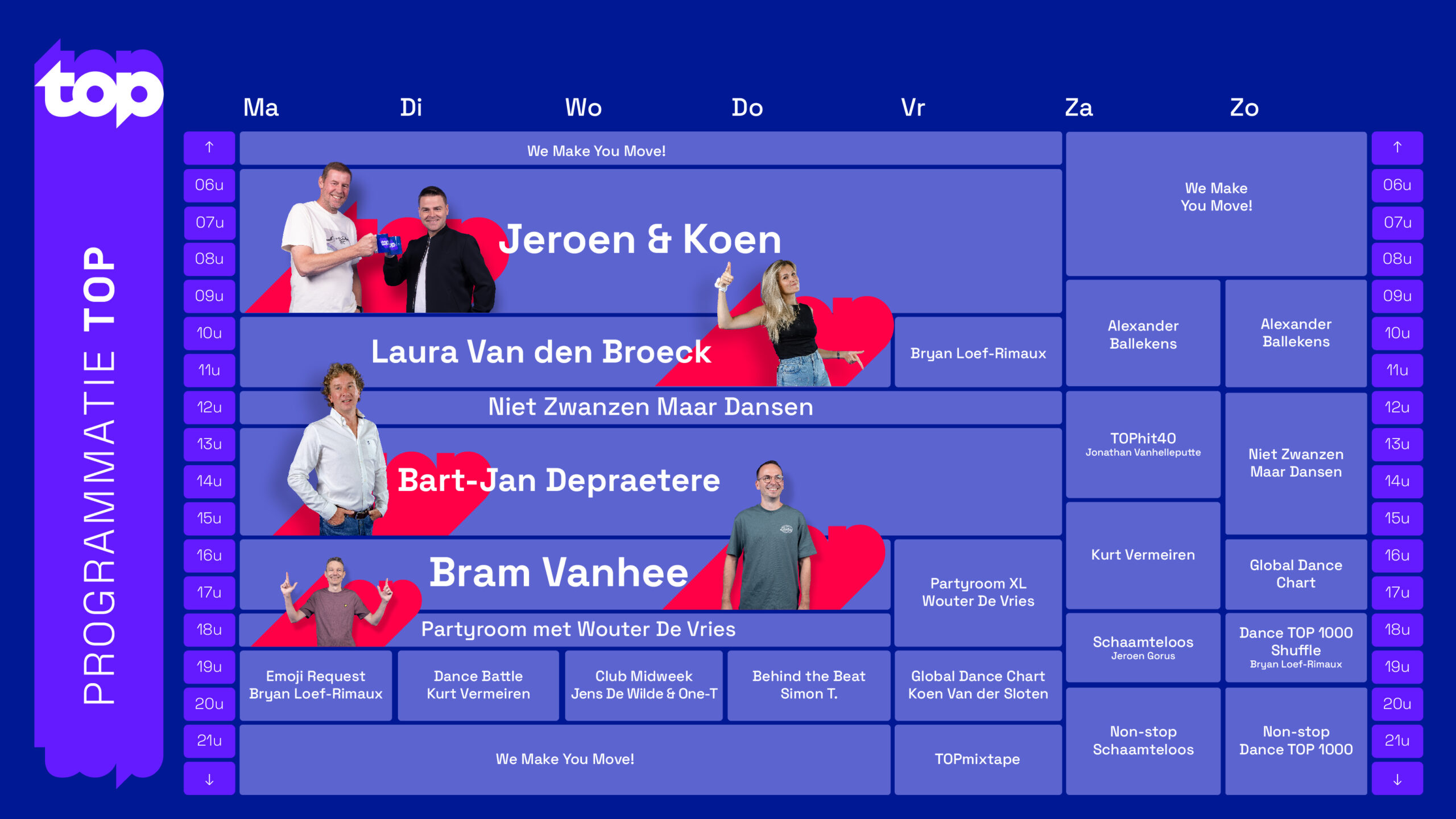 Vanaf maandag 1 september schakelt TOP nog een tandje hoger met een frisse programmatie en de beste dance & dancepop om de luisteraar doorheen de dag van start tot finish in beweging te houden.