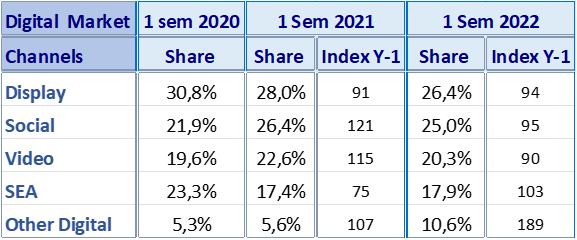 Het totale marktaandeel van ‘Digital’, als som van de kanalen Display, Social, Video, Search Engine Advertising en Other Digital, bedraagt 33,4% van de totale markt en is stabiel (-0,2%) in vergelijking met het eerste semester van 2021.