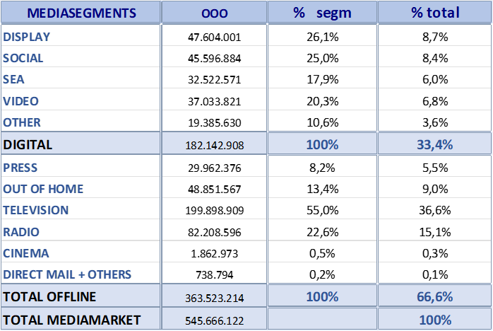 Digitaal (37%) wordt het belangrijkste medium en steekt televisie (33%) voorbij. Van alle investeringen in digitale media gaat 62,8% naar internationale aanbieders. Wel is er een sterke stijging van het lokale aandeel van online video.