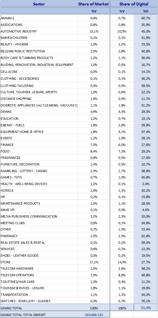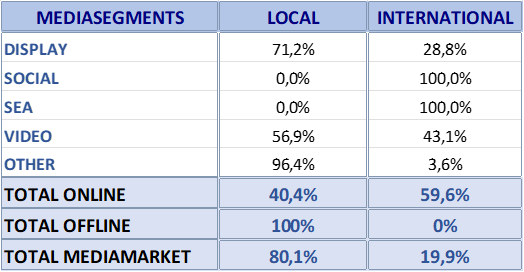 Binnen de digitale kanalen waar er concurrentie is tussen internationale en lokale actoren, is het aandeel van laatstgenoemden systematisch hoger dan dat van de grote internationale spelers. Binnen de kanalen Social en SEA, waarbinnen de enige actieve actoren de GAFAM zijn, bezetten zij uiteraard de totaliteit van deze marktsegmenten.