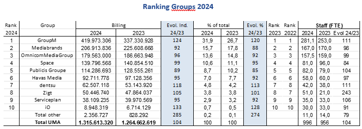 De sterke groei van de drie bureaus van GroupM levert de groep stijging van +24% op, waardoor diens marktaandeel aanzienlijk wordt versterkt (+20%) binnen het groepsklassement. Aldus bevestigt GroupM zijn leiderspositie voor Mediabrands en OmnicomMediaGroup. De rankschikking van de groepen blijft ongewijzigd tegenover die van 2023.