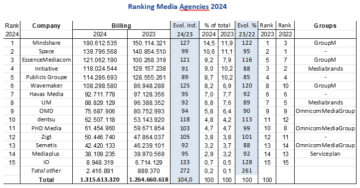 De grootste groei in termen van omzet (+27%) werd geboekt door Mindshare, dat daarmee zijn positie bovenaan het klassement consolideert, voor Space dat stabiel blijft op de tweede plaats. EssenceMediacom gaat twee plaatsen vooruit en stoot door tot de derde plaats, dankzij een sterke omzetstijging van 20,8 miljoen euro (+21%).