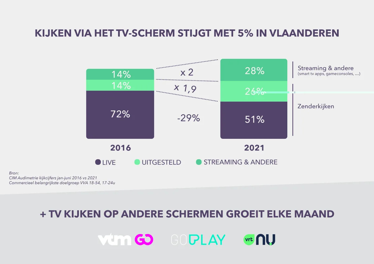 Ons televisiekijkgedrag is de afgelopen jaren sterk veranderd. We verdelen onze kijktijd steeds meer over het gigantische aanbod aan tv- en videocontent én we kijken ook meer dan ooit: de afgelopen 5 jaar steeg het kijken via het tv-scherm met 5%, of dat nu live, uitgesteld of via streaming is. Daarnaast groeit het tv kijken op andere schermen elke maand verder dankzij initiatieven als Go Play, VTM GO en VRT NU.