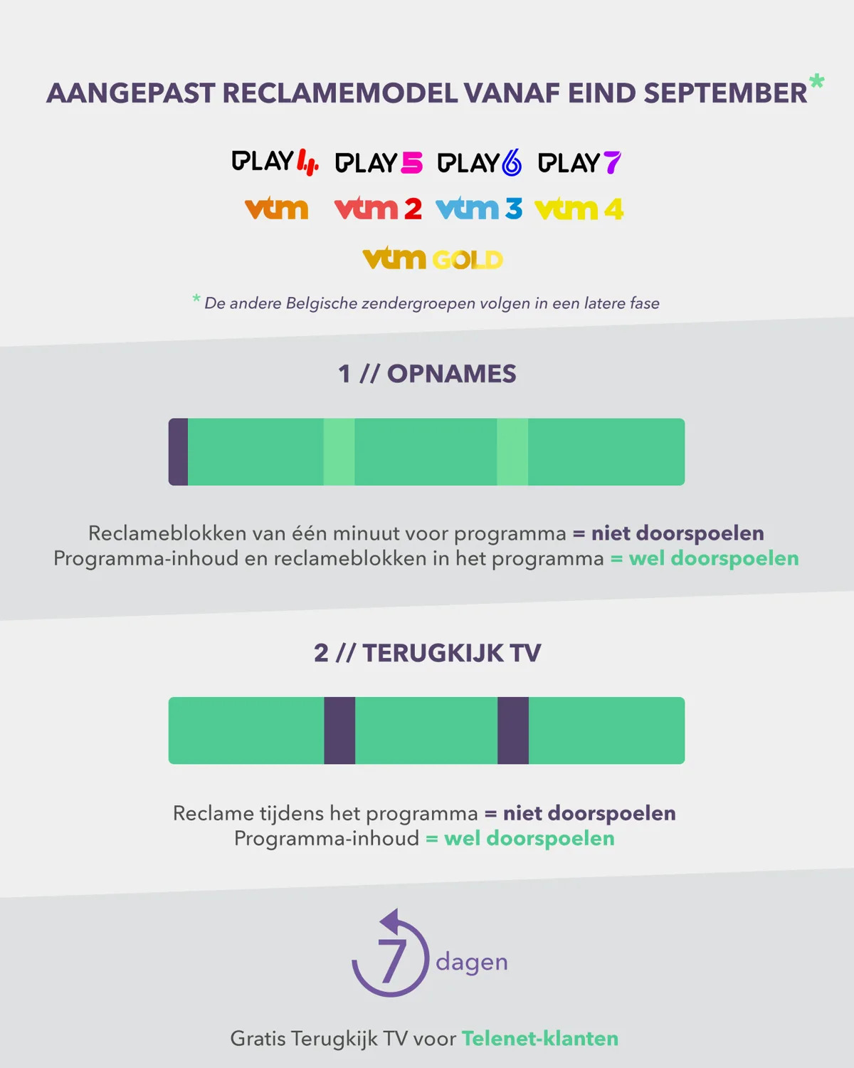 - Opnames van hun programma’s zullen starten met een reclameblok van één minuut dat niet kan doorgespoeld worden. De reclameblokken in het opgenomen programma kunnen wel nog steeds doorgespoeld worden.