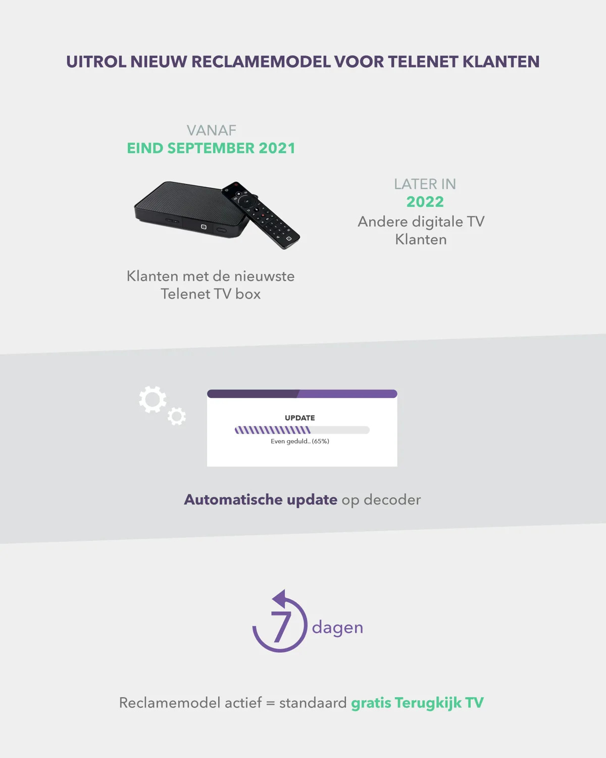 Van zodra het nieuwe reclamemodel geactiveerd is op de decoder, krijgen deze klanten standaard gratis Terugkijk TV: programma’s tot zeven dagen terug gratis herbekijken. Alle betrokken klanten ontvangen hierover de komende weken een persoonlijke communicatie. Klanten krijgen ook een melding op hun televisie van zodra de veranderingen starten.
