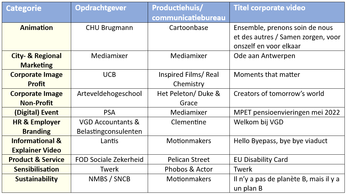 Hieronder vindt u een overzicht van de winnende corporate video’s. Alle winnende en genomineerde inzendingen zijn te bekijken via www.videoexperienceday.be.