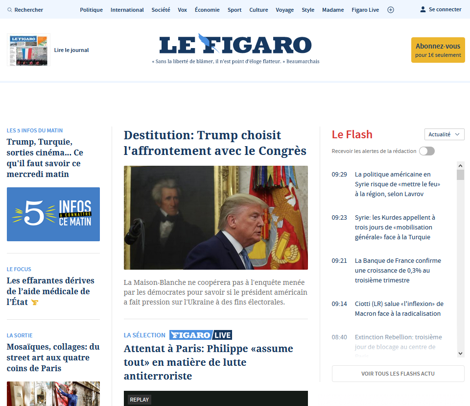 Le site du Figaro fait peau neuve et se modernise pour mieux faire vivre à ses lecteurs les trois temps de l’info. D’abord l’Essentiel de l’information, vérifiée et hiérarchisée par la rédaction, ensuite le Flash avec l’info en temps réel et puis les Rendez-vous du Figaro qui proposent de l’analyse et de l’originalité. Le nouveau site réunit désormais l’offre gratuite et payante au sein d’une page d’accueil unique.