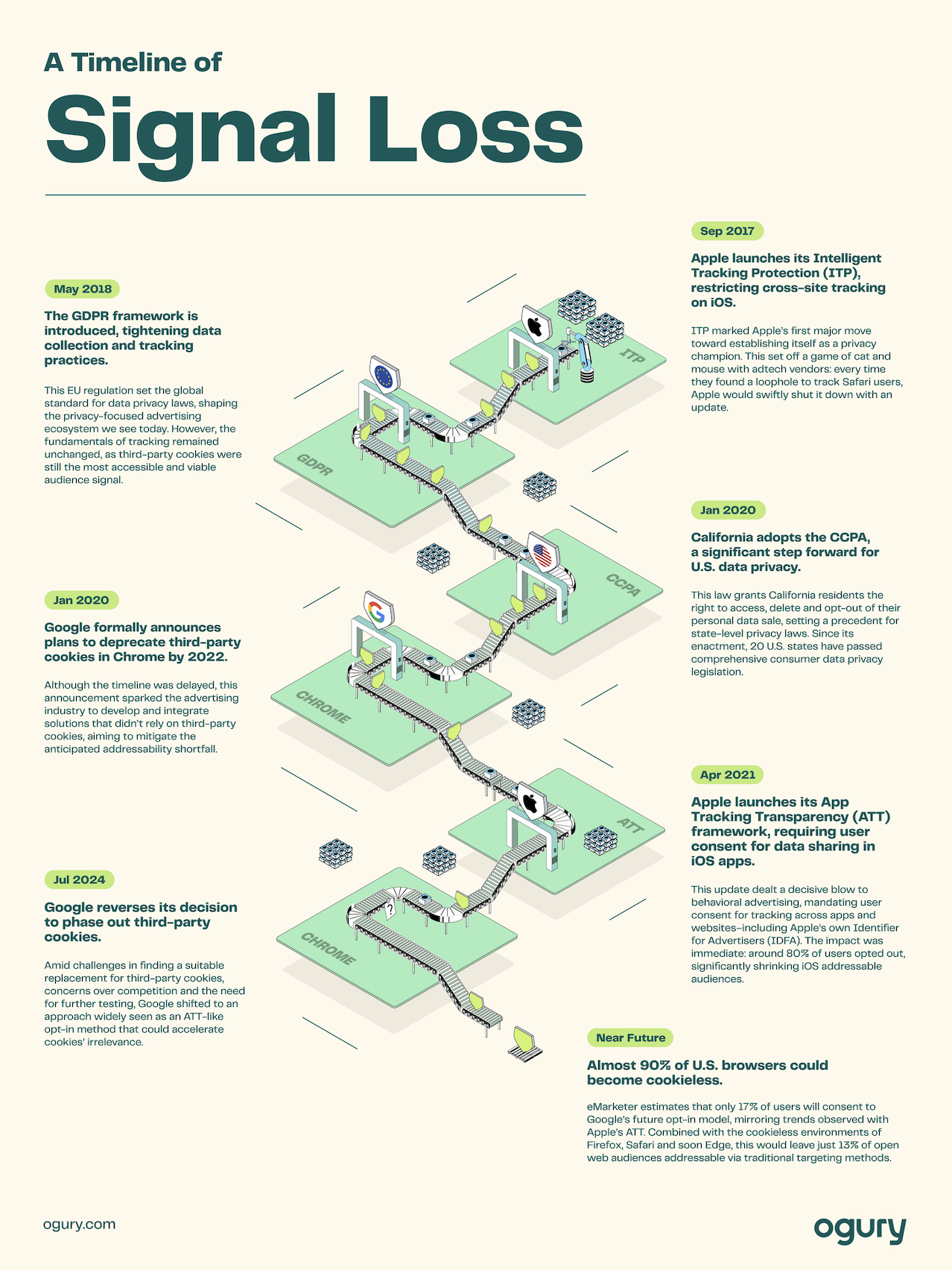 Face aux réglementations de plus en plus strictes et aux initiatives des grandes plateformes pour renforcer la confidentialité des utilisateurs, les annonceurs doivent revoir leurs stratégies publicitaires online. Entre la fin annoncée – puis repoussée – des cookies tiers et l’essor des modèles d’opt-in, le ciblage publicitaire entre dans une nouvelle ère où la data devient une ressource précieuse et difficilement accessible. Ogury analyse cette mutation en infographie.