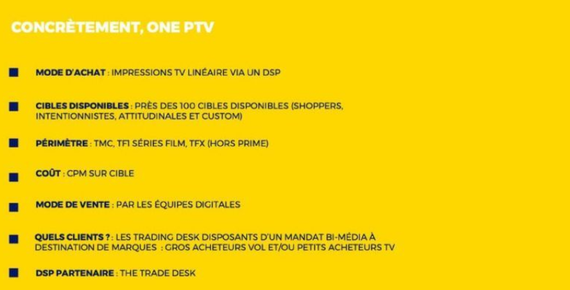 Il s’agit d’une « première en Europe », selon Philippe Boscher, directeur adjoint marketing digital, One data, études R&D de TF1 Pub. Concrètement, cette nouveauté mettra à disposition des trading-desks disposant d’un mandat bi-media, des inventaires linéaires TNT (hors Prime) des chaines TMC, TF1 Séries Film et TFX, vendus par les équipes digitales de la régie au CPM net et sur près de 100 cibles data (shoppers, intentionnistes, attitudinales et custom). Pour ce faire, TF1 Pub s’est associé à The Trade Desk, une DSP (plateforme programmatique digitale) partenaire.