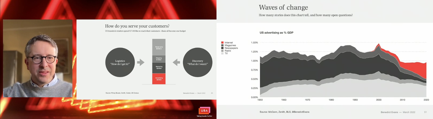 Dans un contexte d’évolution permanente des technologies, il est difficile pour les entreprises de savoir où donner de la tête et à quelle avancée donner le plus d’importance. Selon Benedict Evans (Independent Analyst), le Web3 et le Métavers promettent une révolution des relations sociales, mais d’autres innovations ont fait des promesses similaires sans pour autant devenir universelles (les casques VR par exemple). Cette rapide transition technologique est en marche depuis plus de 50 ans, et les prochains grands succès sont difficilement prévisibles. On peut toutefois observer les tendances auprès des annonceurs, la plus significative d’entre elles étant le déclin des annonces publicitaires. Ce dernier peut cependant s’expliquer par la création de nouvelles stratégies marketing, qui relèvent de la publicité bien qu’elles n’en portent pas le nom, et auxquelles une partie croissante des budgets est allouée : l’argent qui était avant destiné à des annonces est maintenant investi dans le développement de son site internet ou dans la mise en avant de publications sur Instagram. Les budgets changent et s’adaptent au monde qui les entoure, et la publicité est maintenant un élément parmi tant d’autres dans un système plus vaste.