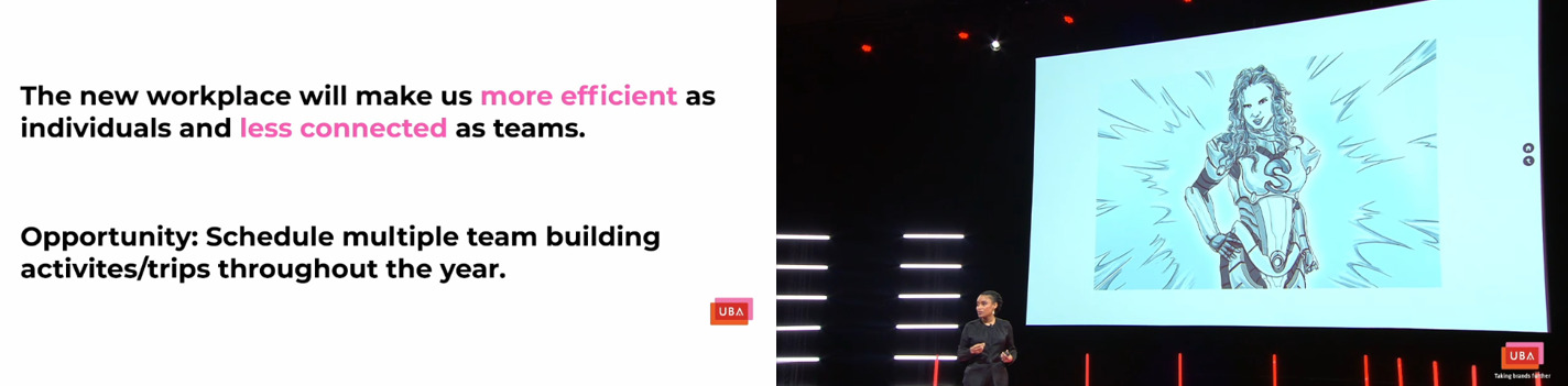 Dans ce contexte, différentes tendances se détachent dans le monde de l’entreprise. On remarque d’abord que la technologie, tout en nous rendant plus efficaces et en nous permettant de travailler depuis chez soi, rend les connections sociales plus difficiles. Ainsi, dans beaucoup de domaines, l’argent gagné par la diminution de la taille des bureaux a été investi dans des activités de teambuilding. Le travail solitaire en distanciel a aussi rendu l’apport de chacun·e plus facile à quantifier – et en supprimant la fonction des middle managers qui pouvaient s’attribuer le travail de leurs équipes sans fournir d’apport personnel, il a été possible de valoriser d’autres fonctions. Enfin, la transition digitale s’est poursuivie par l’utilisation de logiciels d’automatisation, de chatbots… La montée en popularité des IA et des mondes virtuels sont autant d’opportunités pour les professionnel·les du marketing. Selon Crystal Washington, pour prévoir ce que nous réserve l’avenir, il faudra les consommateurs et les personnes qui sont en contact direct avec les problèmes contemporains : « We need to observe those easter eggs to create our ideal workplace, and this is how we can begin to actively shape what’s coming and shift trends coming our direction. »