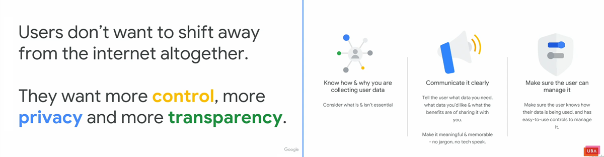 Mais, et c’est là que réside le grand point d’interrogation, « la question qui se pose à propos d’Internet en 2022 est de savoir si un tel modèle publicitaire est suffisamment bon. » Car, explique Matt Brittin, « Internet connaît actuellement un changement fondamental, et les citoyens veulent plus de vie privée et plus de contrôle de leurs données en ligne. Il convient au moins de leur expliquer pour quelle raison vous collectez des données, mais aussi de le faire de manière transparente. » Il ajoute : « Vous devez expliquer clairement à vos utilisateurs en quoi la collection de leurs données est un avantage pour eux. » Quoi que vous fassiez, « it needs to be MUM: Meaningful, Understandable and Memorable. »