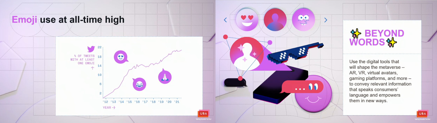 Il faut donc agir. Par exemple, selon la technique « Beyond Words », une tendance que Vicki Loomes décrit comme une conséquence des possibilités numériques et de leur influence sur les jeunes générations : « TikTok et Snapchat sont incroyablement populaires : les jeunes sont très habiles pour communiquer avec une incroyable nuance ». Les emojis, loin d’être simplement plaisants à utiliser, contribuent à façonner ces nouvelles possibilités de communication. « Les jeunes générations parlent un nouveau langage numérique. Les marques doivent s’impliquer et apprendre à comprendre ces nouveaux langages. » Vicki Loomes soutient que les outils numériques (IA, RV, avatars, plateformes de jeux, etc.) doivent être utilisés dans les stratégies de communication. Cela vous aidera à établir un lien avec les consommateurs.