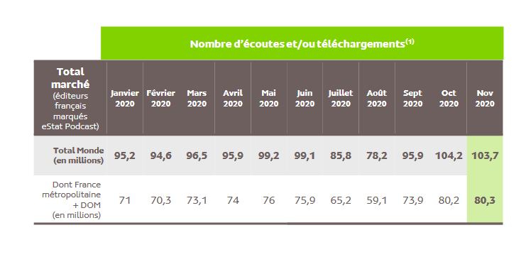 En effet, les podcasts continuent à avoir la cote et l’appétence des Français pour les contenus audio se prolonge : en novembre 2020, près de 104 millions de podcasts ont été écoutés en streaming ou téléchargés, contre 99,2 millions d’écoutes/téléchargements en mai dernier. C’est 8,5 millions de plus qu’en janvier 2020.