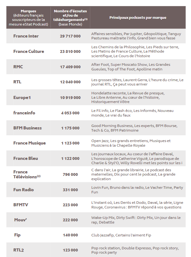 Dans le top 3 des marques média les plus écoutées, on retrouve : France Inter (29 717 000 d’écoutes et/ou de téléchargements) avec des podcasts tels que “Affaires Sensibles, “Par Jupiter” ou encore “Grand bien vous fasse”; France Culture occupe la deuxième position (23 810 000 d’écoutes et/ou de téléchargements) avec les podcasts “Les Chemins de la Philosophie”, “Les Matins de France Culture” ou “La Méthode scientifique” entre autres ; RMC (17 409 000 d’écoutes et/ou de téléchargements) prend la troisième place avec ses podcasts sportifs “After Foot”, “Super Moscato Show” ou “Top of the Foot”.