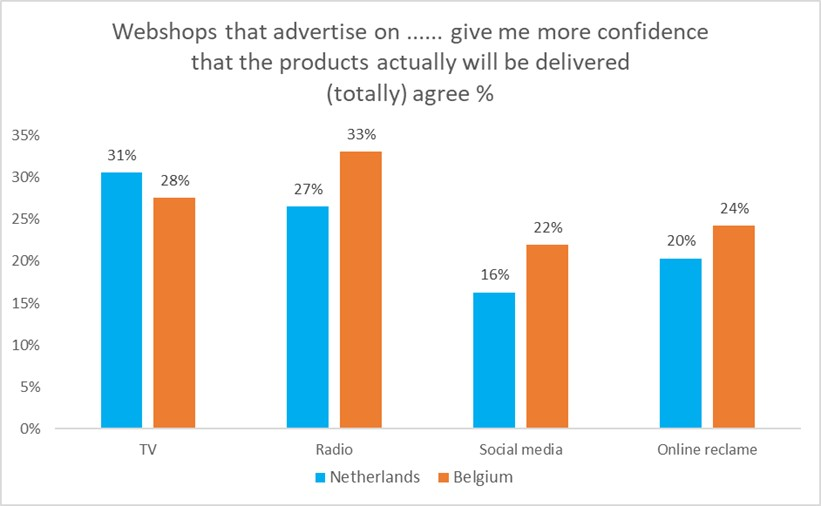 Comme les webshops sans magasins physiques sont complètement virtuels, la confiance importe beaucoup. Comment la développer ? 22 % des répondants est d’accord ou entièrement d’accord avec l’affirmation ‘je fais davantage confiance aux webshops qui n’ont pas de magasins physiques quand ceux-ci font de la publicité à la TV’. Pour la radio, le score est 20%. Sur ce point, les médias sociaux et la publicité en ligne obtiennent une nouvelle fois un score nettement inférieur ; aux Pays-Bas surtout, le faible score des médias sociaux interpelle.