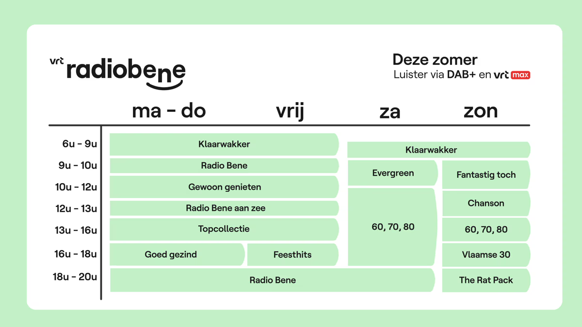 À partir d’aujourd’hui, vous n’écoutez plus Radio2 Benebene, mais VRT Radio Bene. Cette nouvelle station de radio numérique se concentre sur les sons intemporels et les meilleurs artistes de chez nous. VRT Radio Bene est disponible via DAB+, VRT MAX, la télévision numérique ou les smartspeakers.