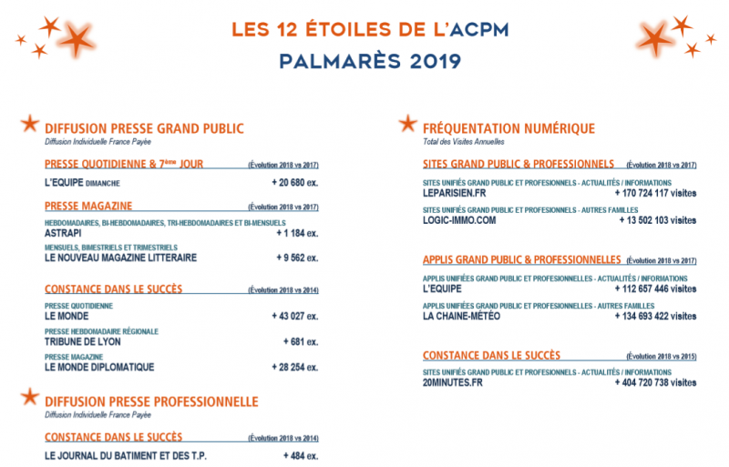 Au cours de la soirée, 12 étoiles récompensant la progression de la diffusion des titres de presse et de la progression des visites pour les sites de presse unifiés (sites fixes + sites mobiles+sites AMP) ont été remises. Retrouvez ici les chiffres et détails de ce palmarès.