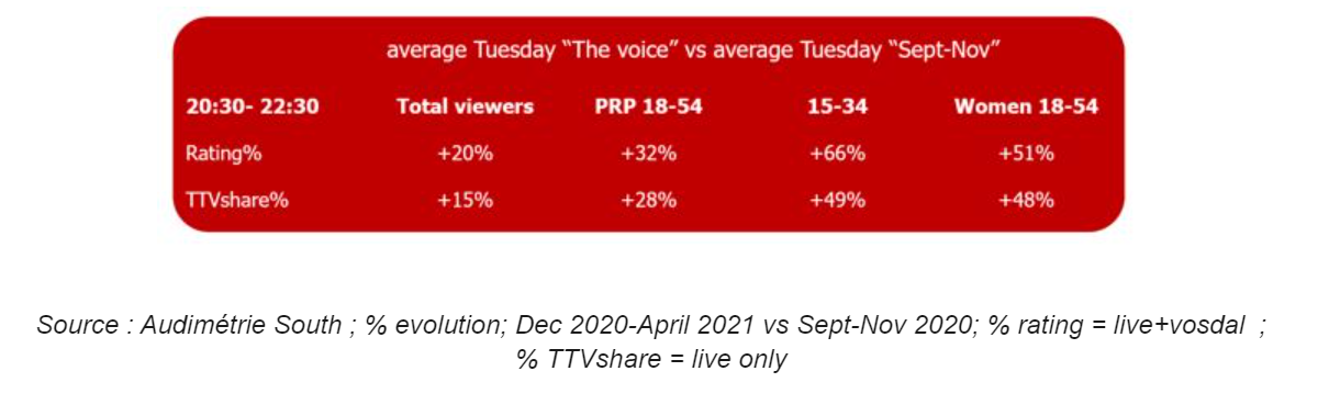 Les écrans publicitaires de coupure « VO » atteignent en moyenne 6 GRP auprès de la cible d’achat des PRA 18-54 ans. De quoi ravir les annonceurs présents autour du divertissement. Saison après saison, The Voice Belgique est une valeur sûre de la grille de La Une. Il s’agit d’un programme fédérateur qui rassemble et fidélise le public francophone année après année. En témoignent les 63% de téléspectateurs communs entre la saison 8 (2019) et la saison 9 (2020-2021).