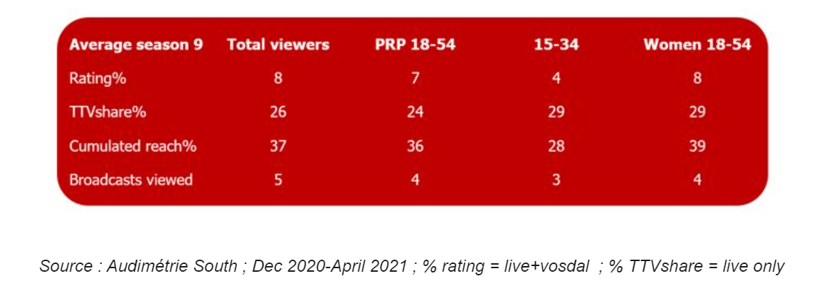 Jérémie Makiese remporte la 9ème saison de The Voice après 16 semaines de compétition. Après 9 années de programmation, l’émission conserve son prestige et séduit toujours de nombreux adeptes. Les jeunes (15-34 ans) et les femmes (18-54 ans), particulièrement séduits par le divertissement, affichent une part de marché moyenne de 29%. La PDM des femmes jeunes (15-34 ans) s’élève à 31%.
