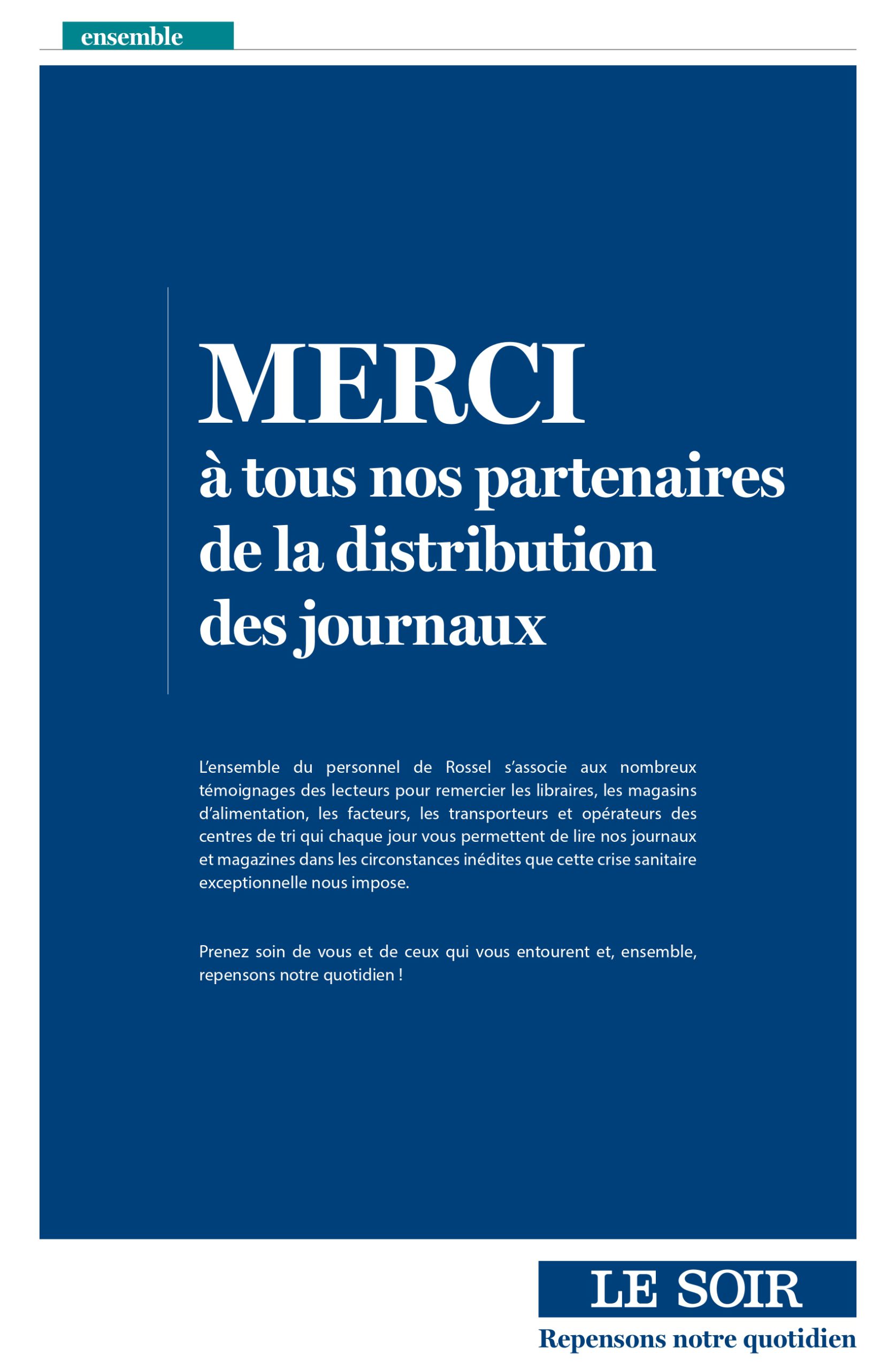 C’est donc l’ensemble du personnel du Groupe Rossel qui s’associe, au sein de ces deux pleines pages, aux nombreux témoignages de lecteurs pour remercier l’ensemble de son réseau de distribution : librairies, magasins d’alimentation, facteurs, transporteurs et opérateurs des centres de tri. Chaque jour, ils permettent aux lecteurs de lire les journaux et magazines dans des conditions totalement inédites que nous impose cette crise sanitaire.