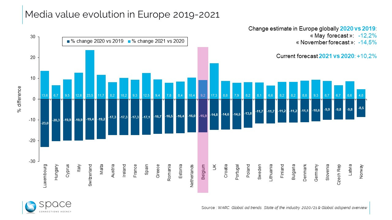 Ces chiffres rendent évidemment compte de la phénoménale destruction de valeur qu’a occasionnée le confinement et la crise sanitaire de 2020. En mai dernier, l’institut prévoyait pour l’année en cours un recul de 12% sur l’ensemble de l’Europe par rapport à 2019. La suite des événements allait encore noircir le tableau, puisque la prévision émise en novembre (celle sur laquelle se basent les données par pays) chutait encore, à -14,5%. Notre pays se situe dans une position centrale : le WARC estime que les investissements médias en Belgique ont régressé de pratiquement 16%. Une position centrale, puisque ni la pire – comme les -23% du Grand-Duché de Luxembourg – , ni la moins mauvaise – celle du Danemark, pointé à seulement -8,5%.