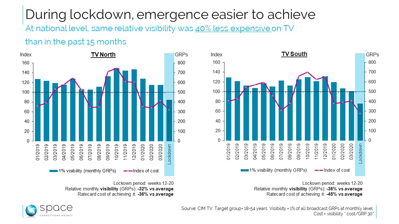 Consolidé sur l’ensemble du pays, un point de visibilité (que nous avons aussi appelé “share of noise” dans le passé) s’est avéré 40% moins cher en coût tarif que pendant les 15 mois précédents ! On peut considérer que l’actuelle crise sanitaire est exceptionnelle. Mais pour les annonceurs qui ont choisi de communiquer durant cette période, l’émergence de leur marque en TV aura été boostée par des écrans publicitaires peu remplis, donc potentiellement très impactants, moins de concurrence et des coûts relatifs avantageux. Bref, une série incontestable d’avantages, à examiner en détail par secteur d’activité.