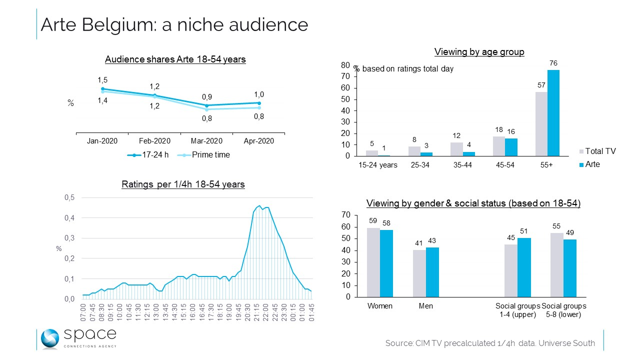 La grande particularité de la chaîne réside dans son profil : si sa part d’audience n’a jamais dépassé 1,5% pour les francophones de 18 à 54 ans, elle a pu atteindre les 3% auprès des aînés ! 76% du volume d’audience mesuré sur Arte est attribué aux 55 ans et plus, lesquels ne représentent que 37% de la population francophone et 57% de la consommation TV dans le sud du pays.