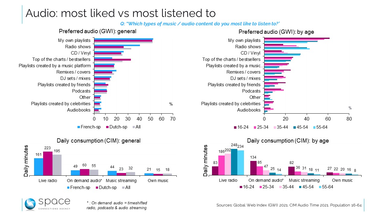 Par contre, il est également utile de mettre ces préférences affichées en perspective. Pour cela, nous avons utilisé les données Audio Time du CIM, récoltées au cours du dernier trimestre 2021. Elles sont exprimées sur le même univers que celui du GWI, soit les 16 à 64 ans. Du coup, on se rappelle que, dans les 5 heures de consommation audio quotidienne, pratiquement 3h ¼ sont consacrées à la radio live. La musique, c’est une cinquantaine de minutes.