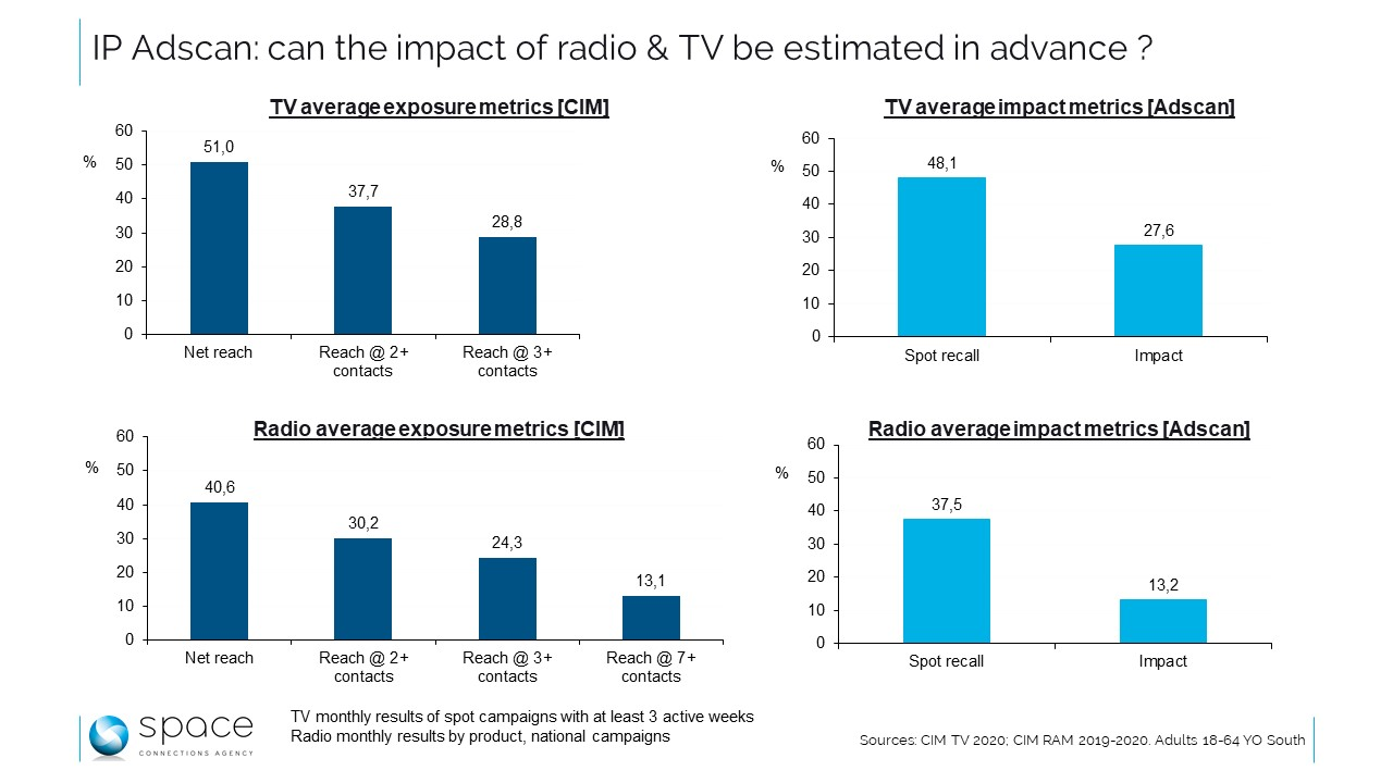 Nous avons comparé ces scores à des moyennes d’exposition sur les mêmes populations (18-64 ans, Sud) et sur la même période (l’année 2020). Pour la télévision, le calcul est très normé : moyenne mensuelle par produit et par mois et 3 semaines minimum de campagne. Et là, surprise, ou non : certains chiffres sont assez proches. Ainsi, en 2020, une campagne TV moyenne touchait 51% de la population 18-64, une valeur dans l’ordre de grandeur de la moyenne de souvenir, 48%. Avec la proportion d’individus touchés à raison d’au moins 3 contacts, la valeur d’exposition (pratiquement 29%) surpasse un peu la moyenne d’impact (de l’ordre de 28%) mais on n’est pas loin.
