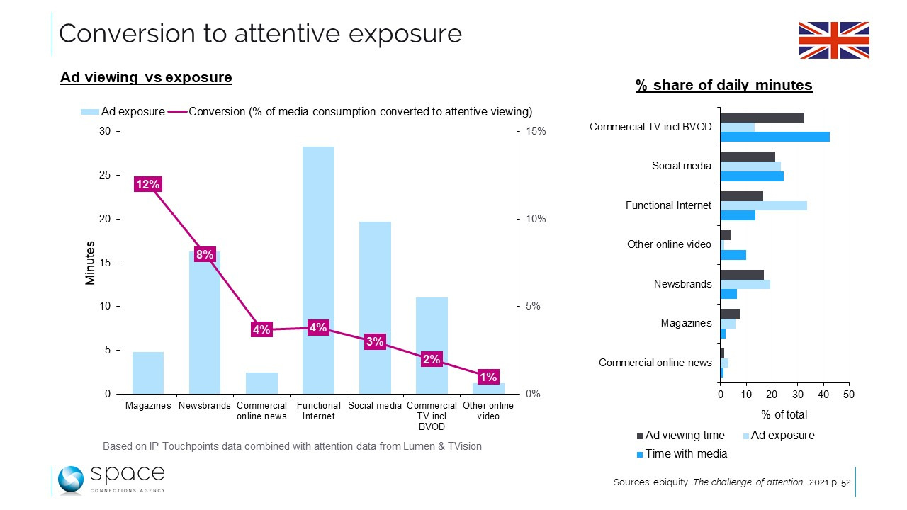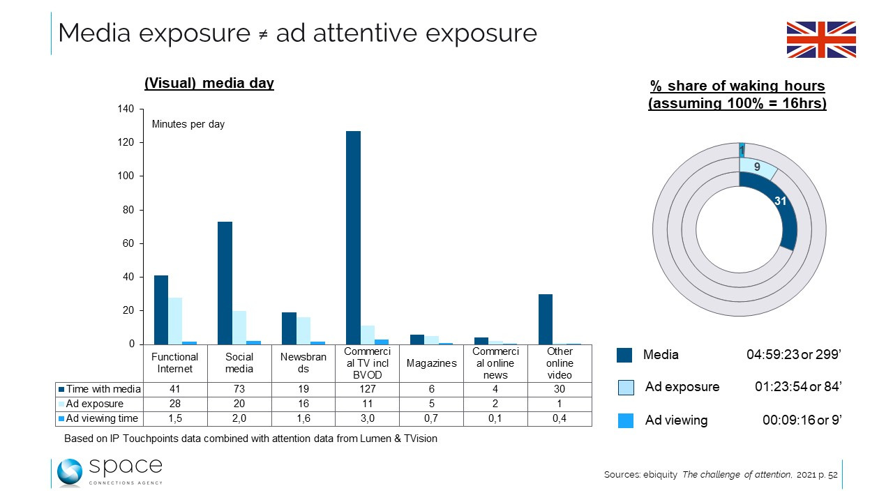 La première source a fourni l’estimation de la durée d’exposition quotidienne aux médias sélectionnés, soit plus ou moins 5 heures. Les autres ont permis d’estimer d’une part le temps d’exposition à la publicité et d’autre part, les fixations de l’oeil effectives sur cette publicité, soit respectivement 84 minutes par jour et juste 9. En tenant compte d’un total de 16 heures éveillées par jour, l’exposition aux médias visuels pèse 31% du total (ebiquity ne précise pas si la durée et la part sont nettes, c’est-à-dire en dédupliquant les utilisations simultanées, ou brutes, soit la simple addition des durées). L’exposition à la publicité ne représente plus que 9% des heures éveillées et la consommation attentive de cette pub 1%.« Les humains sont très doués pour ignorer des choses, spécialement quand il s’agit de publicité », dit Mike Follett, le patron de Lumen Research. Ceci l’illustre parfaitement. En absolu, il y a bien un lien entre le temps d’exposition attentive et la durée d’exposition aux médias : ainsi, avec plus de 2 heures de consommation (1e place), les différentes instances de la télévision commerciale, y compris donc le Broadcaster Video on Demand ou BVOD, donnent 3 minutes d’attention effective à la pub (numéro 1 aussi). Deuxièmes en termes de temps passé (73 minutes par jour), les médias sociaux amènent 2 minutes d’exposition attentive et se classent également 2e sur ce plan.