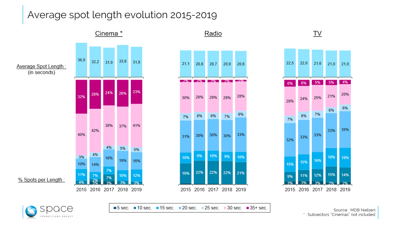 Le cinéma diffuse annuellement un nombre de spots plus de 100 fois inférieur à celui de la radio. Il n’est donc nullement troublant d’y observer plus de variations de la durée du spot moyen dans le temps. Lorsqu’on fait abstraction des spots liés au secteur cinéma (régulièrement des bandes annonces très longues voire des mini reportages) pour se concentrer sur les spots publicitaires, leur durée moyenne a fluctué entre 36″ et 31″ ces cinq dernières années, et 40 % des spots diffusés le sont en 30″. Même si la tendance est un peu à la baisse, le grand écran mérite visiblement toujours des formats plus longs et contrairement à la télévision, le 30″ est toujours ici le standard.