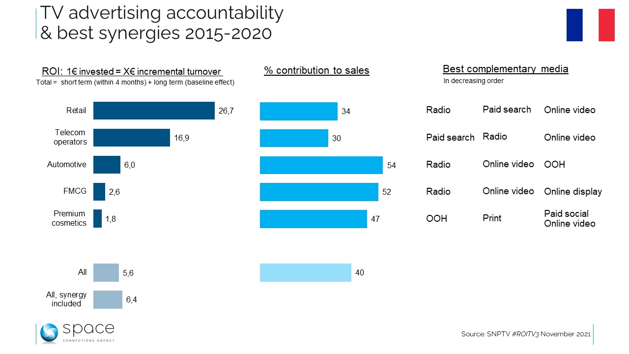 Cette nouvelle édition ajoute une dimension au ROI global : dans certaines conditions, la synergie de la télévision avec les autres médias peut créer un ROI additionnel de 0,8, ce qui porte l’effet moyen de la publicité TV à 6,4 euros pour chaque euro investi. #ROITV3 apporte également des détails sur 5 secteurs de produits différents. Avec des variations plutôt larges : ROI de 1,8 pour la catégorie cosmétiques premium contre 26,7 euros pour la distribution, soit un facteur de presque 1 à 15 ! La contribution moyenne varie elle aussi de 30% pour les opérateurs télécoms à 54% pour l’automobile. Les deux métriques semblent d’ailleurs négativement corrélées : une forte contribution aux ventes irait de pair avec un ROI proportionnellement plus faible et inversement.