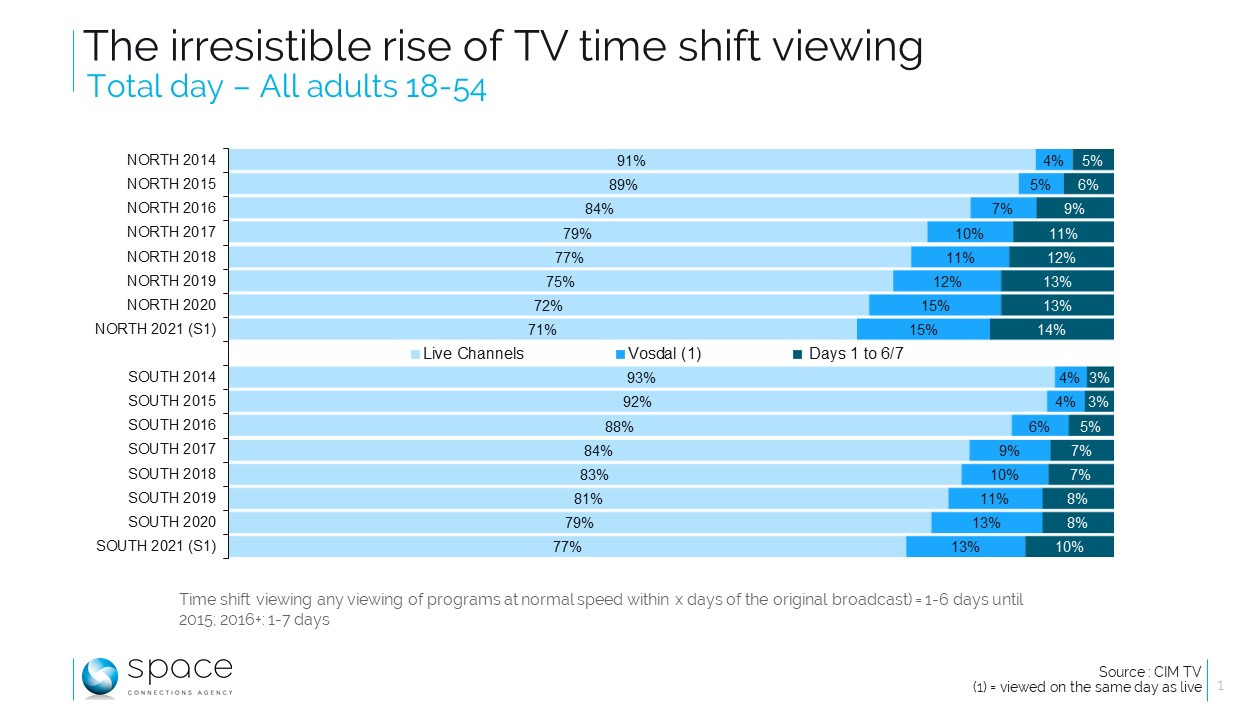Résultat : en dépit d’une forte charge publicitaire, les chaînes TV peinent à fournir les performances attendues par les annonceurs. Il faut dire qu’on parle de sérieuses pertes : si 20% de l’audience proche d’un écran publicitaire disparaît du fait du zapping en live, c’est 64% qui disparaît suite à l’avance rapide en différé. Du moins pour les 18-54 ans dans le Nord, car les pertes sont moins importantes chez les francophones : le zapping en live les prive les audiences pubs de 13% et on y note par ailleurs 45% d’évasion en différé. Bref, en différé, la vision de la publicité est fort malmenée et cette disparition de potentiel d’audience compromet lourdement les revenus des chaînes concernées.