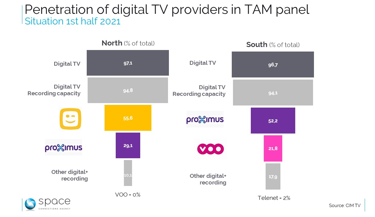 Bien sûr, les chaînes DPG Media et SBS constituent l’essentiel de l’offre de télévision commerciale en Flandre. Mais, toujours en Flandre, Telenet est majoritaire parmi les fournisseurs d’accès, mais pas hégémonique. C’est là qu’intervient notre second graphique. En supposant que le panel actuel utilisé pour la mesure de l’audience TV soit correct par rapport à la répartition des fournisseurs d’accès, un peu moins de 56% de ses membres sont actuellement directement concernés par l’annonce faite. Ils sont en effet répertoriés comme disposant d’au moins un décodeur Telenet avec possibilité d’enregistrement. Même au niveau des fournisseurs d’accès, cela veut dire qu’il y a une concurrence possible. Or, celle-ci a annoncé son intention de rejoindre la manière Telenet de brider les capacités des décodeurs, mais il n’y a pas de calendrier précisé pour cela. Bref, pendant un laps de temps non défini, cela pourrait être « open bar » pour des fournisseurs d’accès qui ne brideraient pas leurs propres boîtes. Bien sûr, cela ne videra pas Telenet de tous ses abonnés, mais cela pourrait compromettre une partie du supplément d’audience attendu.