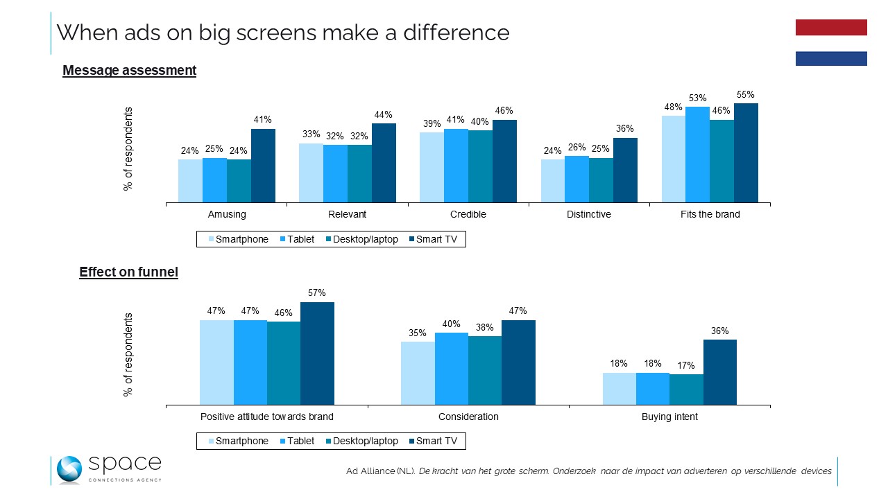 Reste que les résultats du grand écran sont généralement assez détachés du reste du peloton. Certainement en ce qui concerne certains attributs créatifs, comme le côté amusant et la pertinence du message, où les différences avec les autres écrans s’avèrent statistiquement significatives.