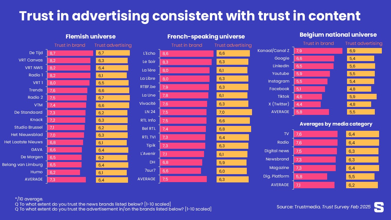 Si maintenant on examine le Trust Survey par catégorie de médias, on constate une grande proximité entre les scores moyens des médias dits traditionnels ou de l’information digitale locale (soit VRT NWS ou RTL Info, pour citer deux exemples) et un contraste important entre ces offres locales et les plateformes digitales, tirées vers le bas par des scores de confiance médiocres sur X (ex-Twitter) ou TikTok pour ne citer qu’eux (aucune surprise ici : la confiance dans les réseaux sociaux ou les plateformes technos est généralement basse, quelle que soit l‘étude consultée).
