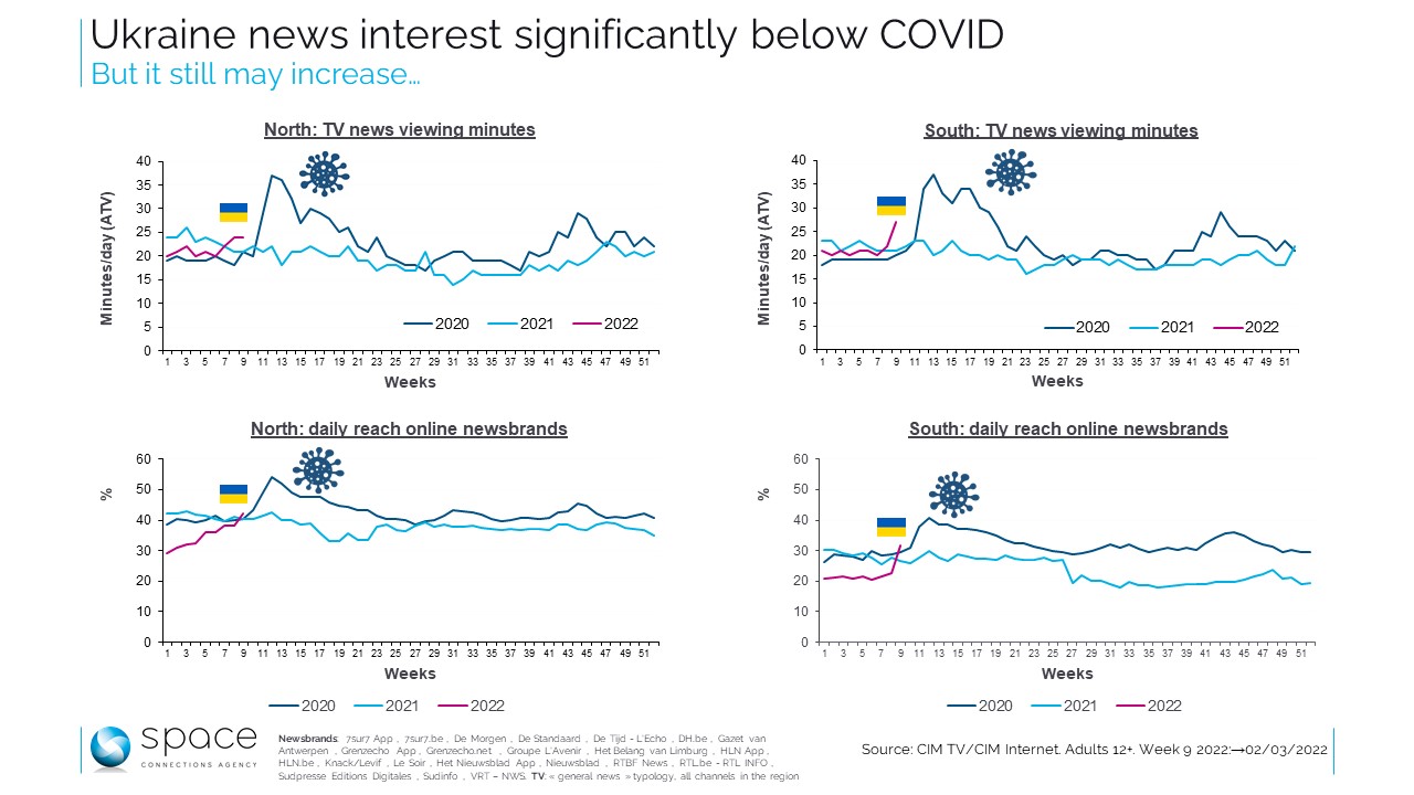 La guerre en Ukraine se lit ici aussi, avec une montée graduelle de l’intérêt côté Nord et une accélération brutale chez les francophones. Mais des deux côtés, la comparaison avec le peak Covid montre que l’invasion de son voisin par la Russie ne rivalise pas (encore ?) avec l’intérêt des Belges pour les nouvelles de la pandémie. « I don’t want to see the news (yet ?) » est peut-être le refrain d’aujourd’hui.
